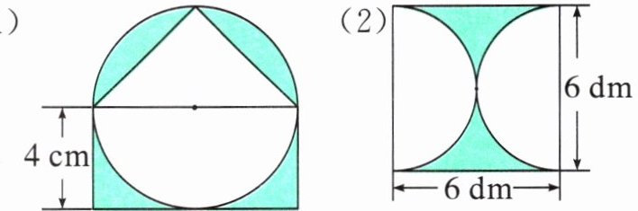 (2)题图中阴影部分面积是正方形面积减去一个圆的面积。列式是6×6−3.14×(6÷2)²=7.74(dm²)。