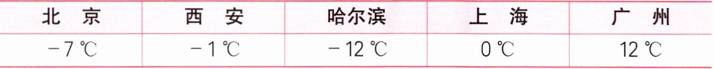 12 - 7 = 5(℃) 12 + 1 = 13(℃) 解析:该日,北京的平均气温是零下7℃,哈尔滨的平均气温是零下12℃,它们的平均气温都在零下,所以北京与哈尔滨的平均气温的温差是(12 - 7)℃;广州的平均气温是零上12℃,西安的平均气温是零下1℃,所以广州与西安的平均气温的温差是(12 + 1)℃。
