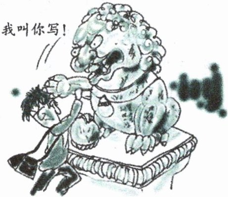 一个小孩正在一处文物上书写“到此一……”,还没写完,他的手臂就被文物上的石狮子紧紧抓住。