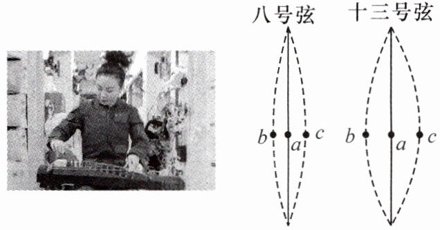 12. 如图所示,王亚平在“天宫”弹奏古筝,分别拨动古筝的八、十三号弦,用同一设置的相机拍摄到两弦最左摆到b处,最右摆到c处,静止时在a处。测出每振动880次,八号弦用时2s,十三号弦用时4s,则八号弦(