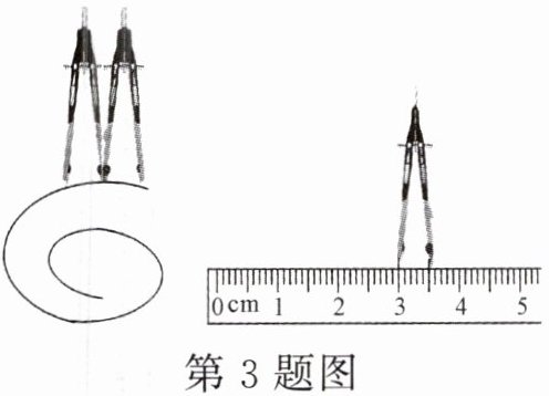 3. 如图是用圆规测曲线长度的一种方法,先将圆规两脚分开,记下圆规分割曲线的总段数$n$,然后测出圆规两脚间的距离$l$,那么曲线的长度$L=$