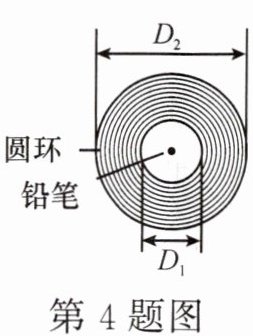 4. 一条纸带厚薄均匀,若把纸带紧密地环绕在圆柱形铅笔上,恰好能套进一个圆环内。如图所示,纸带在铅笔上环绕了$n$圈,则纸带厚度是