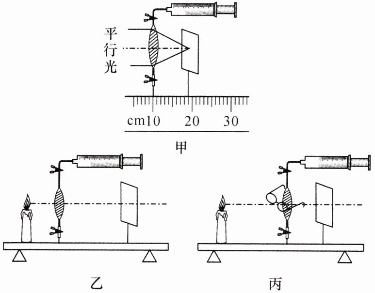 (1)如图甲所示,一束平行于主光轴的光射向水透镜,在光屏上得到一个最小光斑,则此时水透镜的焦距为