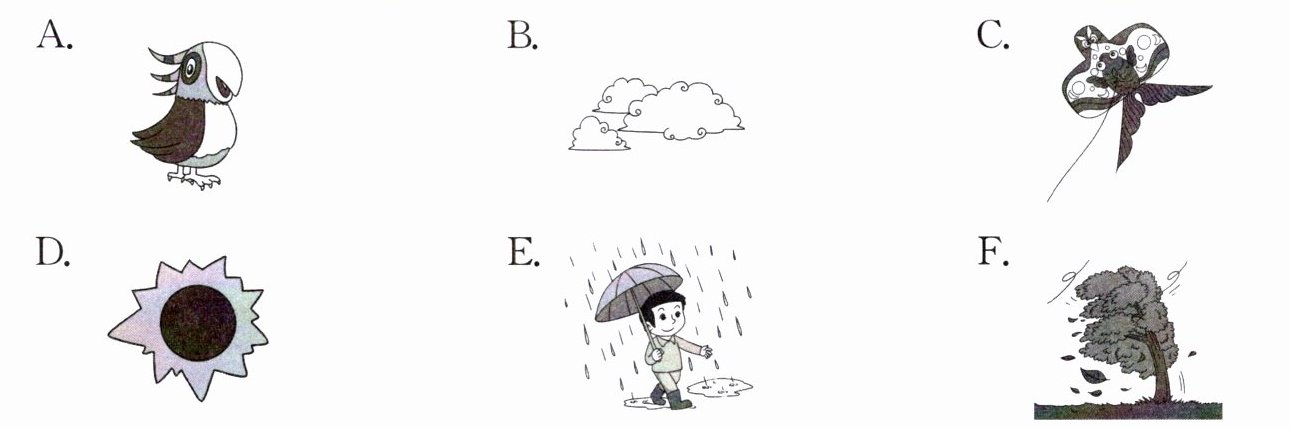 1. cloudy B 2. rainy E 3. windy F 4. parrot A 5. sunny D 6. kite C