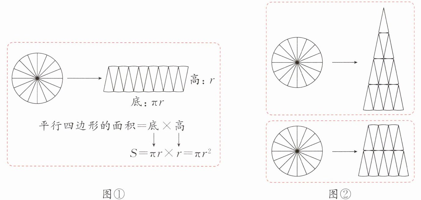 6 在探究圆的面积时,奇思把圆分成16等份,将圆通过切割、拼组转化成近似的平行四边形(如图①),推导出了圆的面积公式。他还想将圆转化成以前学过的其他图形来推导圆的面积公式(如图②)。请你帮助奇思完成下面的推导过程。(圆的面积用S表示,圆的半径用r表示,圆周率用π表示)