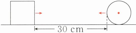 圆的速度为$4÷(1-\frac {1}{3})=6$(厘米/秒)步骤二 计算运动的路程。 从开始运动到完全分开,正方形和圆运动 的路程为30cm加上正方形的边长再加上圆 的直径即$30+10+10=50(cm)$。 步骤三 计算经过的时间。 经过的时间是$50÷(4+6)=5$(秒)。