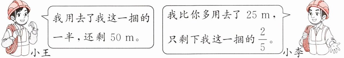 4. 小王:$50×2=100(m)$ 小李:$(100-50+25)÷(1-\frac {2}{5})=125(m)$ 答:小王带了100m网线,小李带了125m网线。