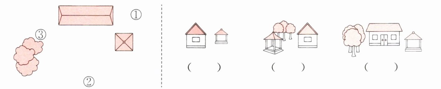 2. 下面左图是晴晴家附近的平面图(部分),下面右图三个画面分别是站在哪个位置看到的?请将对应的序号填在括号里。