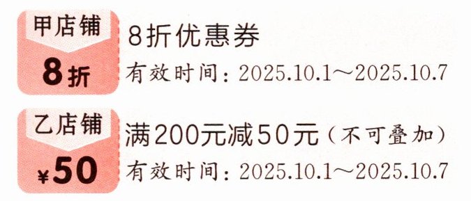 3 国庆节期间,两个店铺出售同一款原价为7元/瓶的果汁,各自给出不同的优惠券(如下图)。要买 40 瓶这种果汁,在哪个店铺购买更省钱?