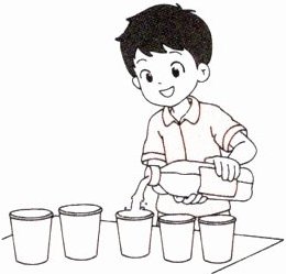 6 林林给同学们分牛奶,他把2瓶共600mL的牛奶倒入如图所示的几个杯子中,正好都倒满且没有剩余。已知一个小杯子的容量是大杯子的$\frac {2}{3}$,每个大杯子的容量是多少毫升?