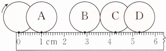 6. 淘气从硬纸板上剪下一个直径在 1~1.5 cm 的圆。如右图,这个圆从直尺的 0 刻度线出发,在直尺上滚动一周后,它的位置可能在(