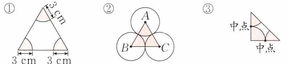 7. 下图中,图形①是一个等边三角形,图形②中三个圆的半径均为 3 cm,图形③是一个等腰直角三角形,且腰长为 6 cm。图形①②③中涂色部分的面积相比,(