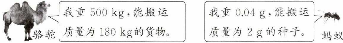 4 根据下面的数据,分别写出骆驼和蚂蚁能搬运物体的质量与它们自身体重的比,并算出比值。相对于自身的体重,你觉得它们谁的力气更大?为什么?