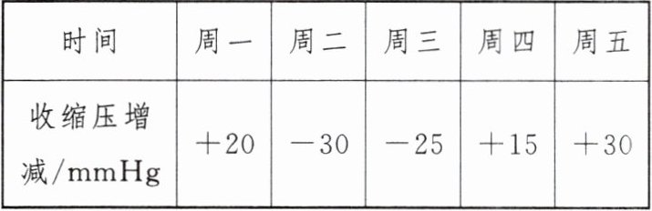 8. 某病人每天下午需要测量血压,该病人上周日收缩压为$120 mmHg$.下表是该病人这周每天与前一天相比,收缩压的变化情况,则该病人本周五的收缩压是