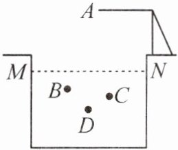 16. 如图,$MN$ 为一个泳池内的水平面. 某跳水运动员(看作一个点)从点 $A$ 处起跳,点 $B,C,D$ 为他三次跳水后落入水中的位置,已知点 $B$ 与点 $D$ 的高度差是 $1.5m$,点 $C$ 与点 $A$ 的高度差是 $10.5m$. 以水面为基准,在水面上方记为正,下方记为负,点 $A$ 表示的是 $+7.5m$,点 $B$ 表示的是 $-2m$,则点 $B$ 比点 $C$ 高多少?点 $D$ 比点 $A$ 低多少?