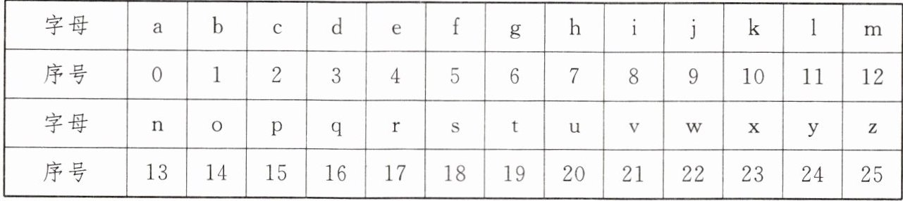 1. 有一种密码,将 26 个英文字母 a,b,c,…,z(不论大小写)依次对应 0,1,2,3,…,25 这 26 个自然数(见表格)。当明码对应的序号 $ x $ 为奇数时,密码对应的序号为 $ \frac{\vert x - 33\vert}{2} $;当明码对应的序号 $ x $ 为偶数时,密码对应的序号为 $ \frac{x}{2} + 5 $。按上述规定,将明码“efuz”译成密码是(