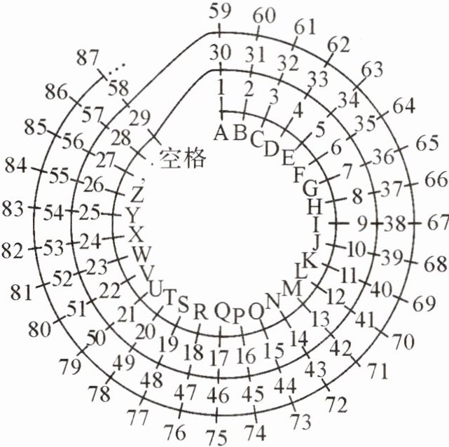 2. 如图,这是一个密码盘,这个密码盘在数字和字母之间可建立一种对应关系,其中数字为密文,字母为明文。小明根据该密码盘,编制了一个密码规则,例如:密码“35 71 14 32”翻译成明文为“HOPE”。按照小明的编制的密码规则,将“63 16 3 57 76”翻译成明文为“