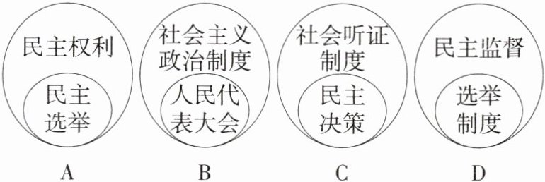 A 本题考查参与民主生活。民主选举是人民实现民主权利的一种重要形式,A正确。人民代表大会是我国的权力机关,人民代表大会制度是我国的根本政治制度,B错误。社会听证制度属于民主决策的一种途径,C错误。民主监督是公民行使民主权利的途径之一,选举制度是我国社会主义民主制度中的一种,二者不是包含关系,D错误。