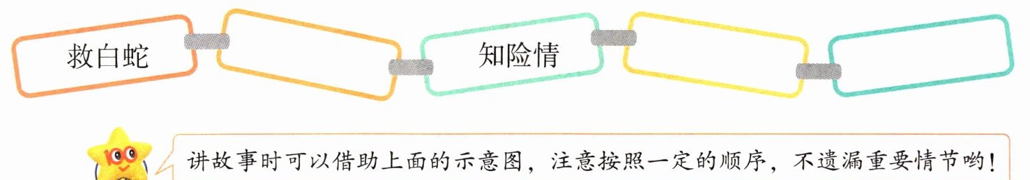 妙招 概括情节时,可以先看一看空缺处对应故事的哪一部分,然后概括相应部分的内容,注意格式尽量与示例中的一致,如本题中“救白蛇”和“知险情”都是“动词+名词”结构的三字短语,所填的情节也应是这种格式。