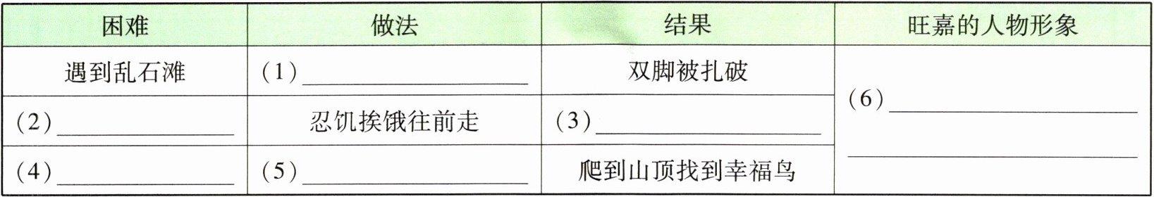 2. (新题型)旺嘉要找到幸福鸟,必须过三道难关。他遇到了哪些困难?是怎么克服的?由此可以看出他是个怎样的孩子?请在文中提取相关信息,填写在表格内。