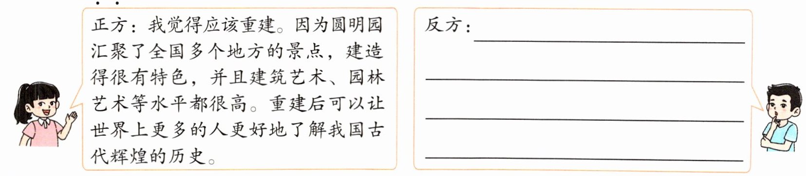 [辨一辨](新情境)参观完圆明园后,老师组织同学们观看了一段用动画复原后的圆明园昔日辉煌景象的视频。同学们深受震撼,由此引发了一场对于“是否应该重建圆明园”的激烈辩论。请你代表反方说一说理由。