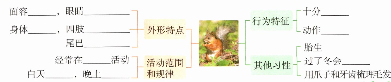 三 [做松鼠推介员](新题型)松鼠推介员要借助下面的思维导图介绍松鼠,请你补全信息。