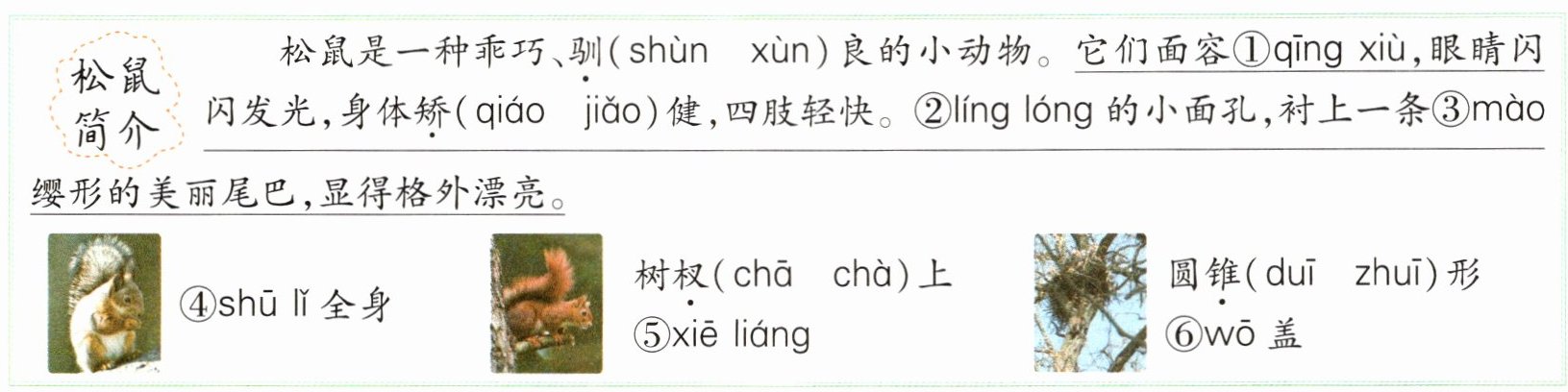 松鼠是一种乖巧、驯(shùn xùn)良的小动物。它们面容①qīng xiù,眼睛闪闪发光,身体矫(qiáo jiǎo)健,四肢轻快。②líng lóng的小面孔,衬上一条③mào缨形的美丽尾巴,显得格外漂亮。
