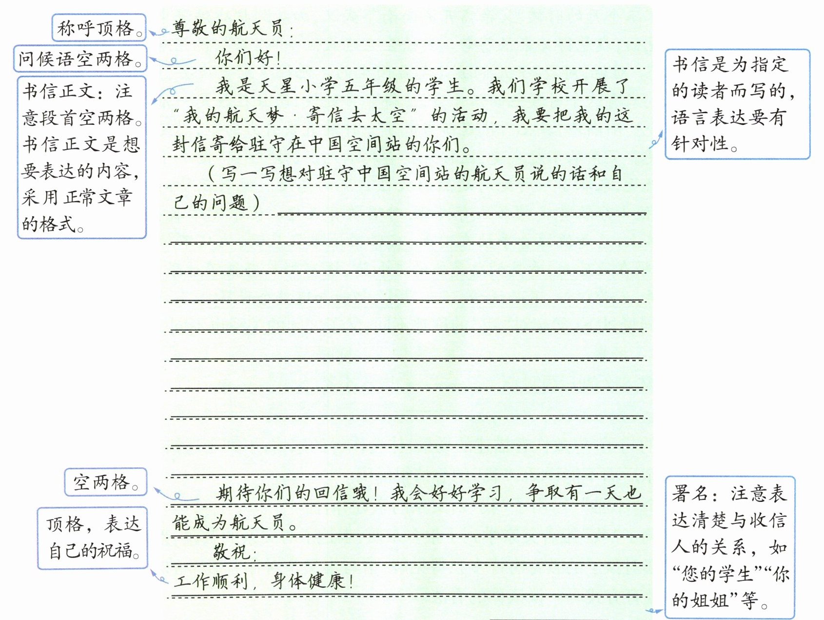 书信正文:注意段首空两格。 我是天星小学五年级的学生。我们学校开展了“我的航天梦·书信去太空”的活动,我要把我的这封信寄给驻守在中国空间站的你们。