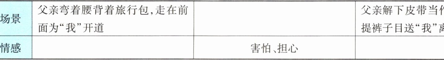 1. 第一行:旅行包拉链坏了,父亲捡拾散落的东西 第二行:埋怨 感动 2. 父亲的样子很滑稽 有些不好意思 看到父亲为了“我”而受到别人的取笑,心里很难受 3. 示例:文中的父亲是一个慈爱的、关心孩子的人。父亲送“我”上学时,帮“我”扛着重重的旅行包,在包里塞满了吃的,而且不顾形象地抽出自己的皮带给“我”当包带,从这些都可以看出父亲的慈爱以及对“我”的关心。 4. 示例:因为父亲抽出皮带的动作中饱含着对“我”深深的爱,“我”被父亲的这一动作感动,所以觉得这是“世界上最酷的动作”。