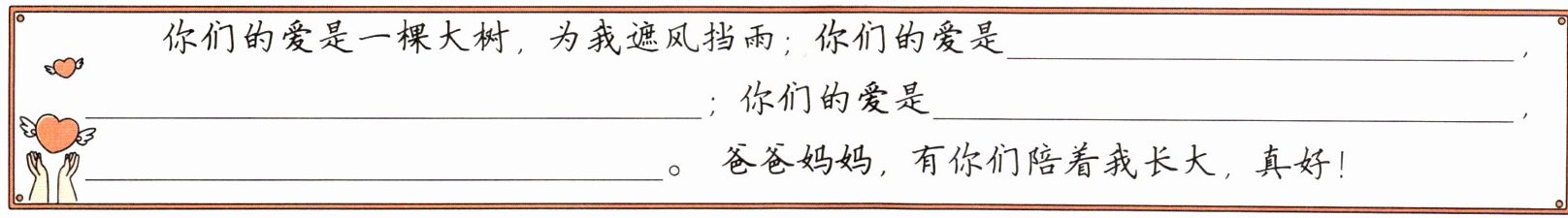 你们的爱是一棵大树,为我遮风挡雨;你们的爱是 , ;你们的爱是 , 。爸爸妈妈,有你们陪着我长大,真好!
