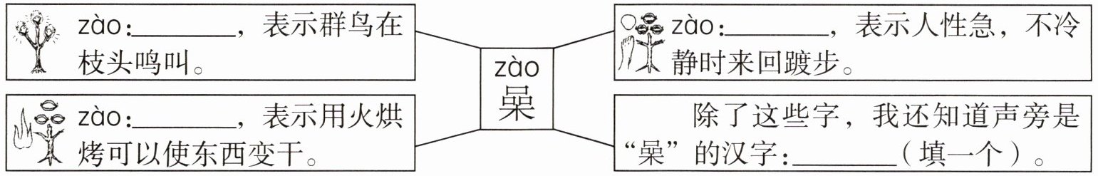 2. 小星的发言要用到不同的"zào"字,可是她分不清楚,请帮忙区分辨别。