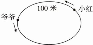 8. [2025 盐城月考]如图,运动场环形跑道周长为 300 米,爷爷一直都在跑道上按逆时针方向匀速跑步,速度为 4 米/秒,与此同时小红在爷爷后面 100 米的地方也沿该环形跑道按逆时针方向运动,若两人第一次相遇所用的时间为 60 秒,则小红的速度为____米/秒.
