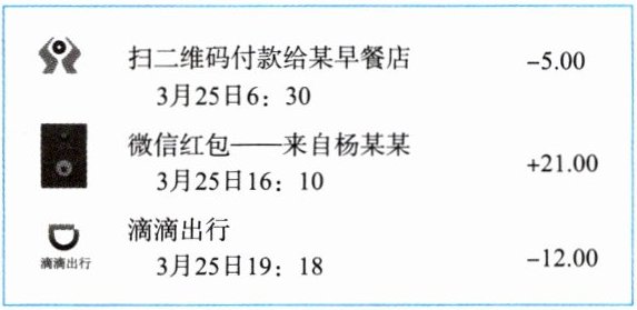 5. 手机移动支付给生活带来了便捷,如图是黄老师2025年3月25日微信账单的收支明细(正数表示收入,负数表示支出,单位:元),黄老师当天微信收支的最终结果是( )