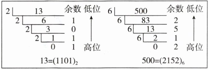 $6\vert500$(余数低位),$6\vert83…2$,$6\vert13…5$,$6\vert2…1$,$0…2$(高位),即$500= (2152)_6$。