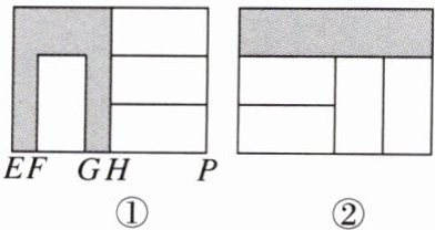 D 【点拨】设题图中小长方形的宽为$x$,长为$y$,大长方形的宽为$b$,长为$a$,根据题意,得$2x+y=a,2x=y$,则$2y=a$,所以$EH=a-y=y$. 故易得题图①中阴影部分的周长为$2b+4y=2a+2b$,题图②中阴影部分的周长为$2(a+b-y)=2a+2b-2y$,所以题图①中阴影部分的周长与题图②中阴影部分周长的差为$(2a+2b)-(2a+2b-2y)=2y=a=4x$,即题图①与题图②中阴影部分周长的差为$4FG=EP=2EH$.
