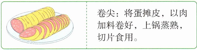 卷尖:将蛋摊皮,以肉加科卷好,上锅蒸熟,切片食用。