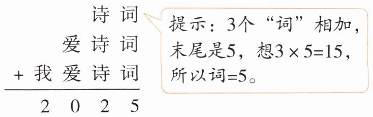 $\begin{array}{r} \quad\quad诗\enspace词\\ \quad爱\enspace诗\enspace词\\ +我\enspace爱\enspace诗\enspace词\\ \hline 2\enspace0\enspace2\enspace5\end{array} $