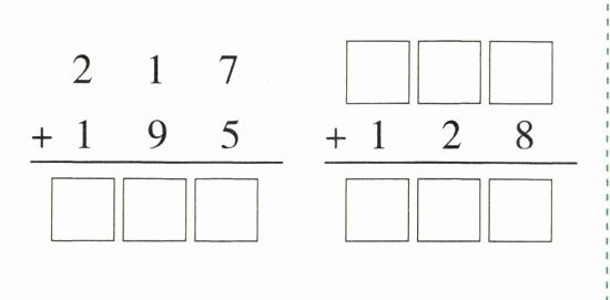 $\begin{array}{r} 2\enspace1\enspace7\\ +1\enspace9\enspace5\\ \hline □□□\end{array}\\ \hline □□□ $ $\begin{array}{r} □□□\\ +1\enspace2\enspace8\\ \hline □□□\end{array}\\ \hline □□□ $