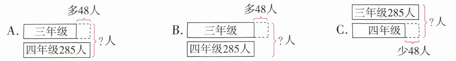 (2)实践活动中,三年级 285 位同学参加了蔬果种植,四年级参加的人数比三年级少 48 人。两个年级一共有多少人参加了本次活动?能表示题目数量关系的是( )。