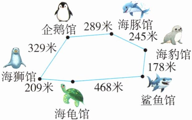 3 小天一家到海洋公园游玩,他们参观了海狮馆之后打算到海豹馆去,走哪条路近?近多少米?
