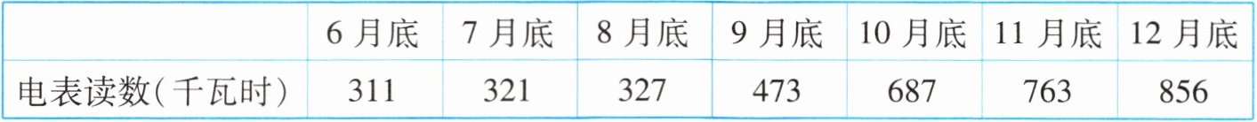 | 电表读数(千瓦时) | 311 | 321 | 327 | 473 | 687 | 763 | 856 |