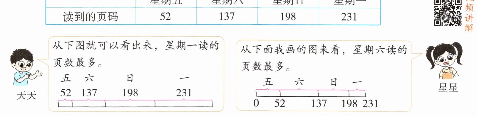 我同意星星的说法。理由:表格中的52、137、198、231表示的是读到了哪一页,不是表示每天读了多少页。(理由合理即可)