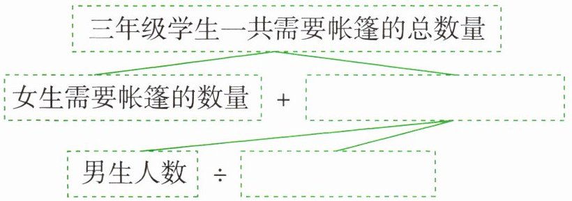 3 (情境题·生活情境)学校组织学生进行野营训练,三年级男生有36人,每4人住一个帐篷,女生住了7个帐篷,那么三年级学生一共需要多少个帐篷?下面是乐乐解决这个问题的思路,请你先补充完整,再列综合算式解答。