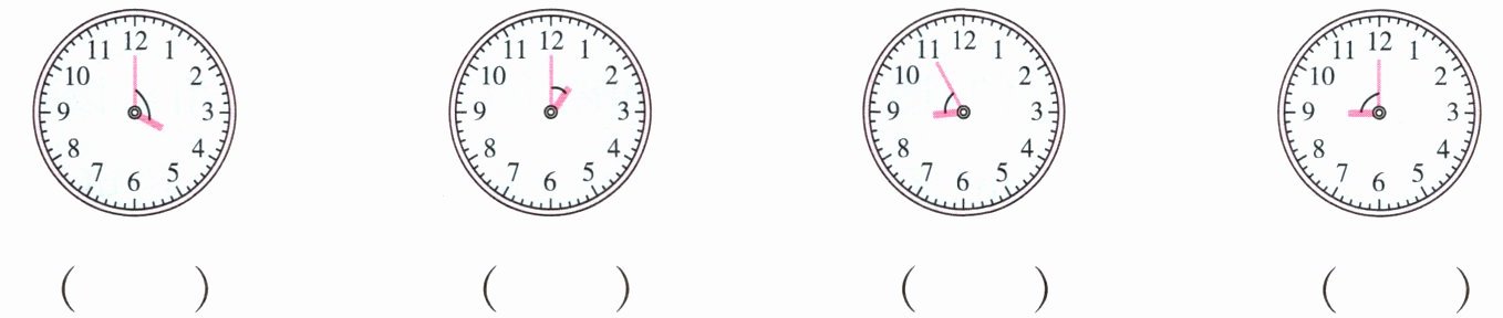 4 把时针和分针组成的4个角按从小到大的顺序在括号里写1、2、3、4。