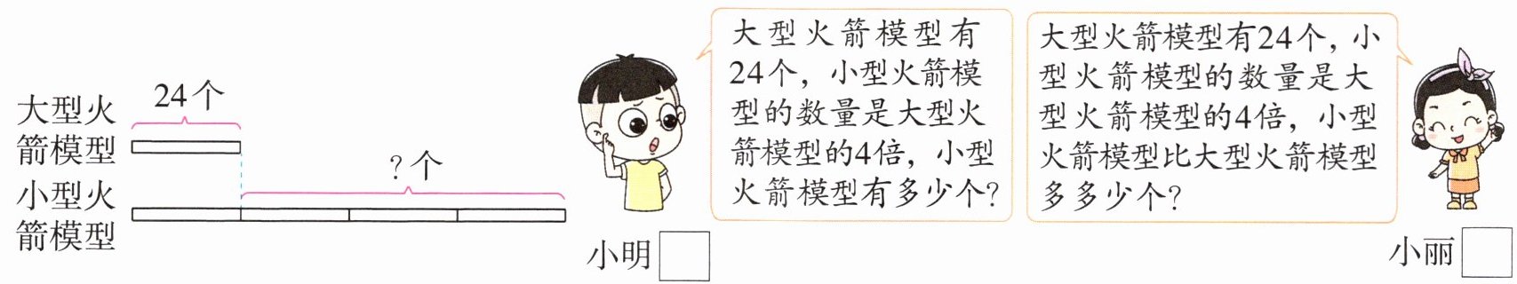 (2)24×(4−1)=72(个)答:小型火箭模型比大型火箭模型多72个。