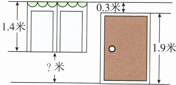 解析 观察题图可知,窗户的高度 + 窗户离地面的高度 = 门的高度 + 门离窗户顶部的高度,即 1.4 米 + 窗户离地面的高度 = 1.9 米 + 0.3 米,1.9 + 0.3 = 2.2(米),所以窗户离地面的高度是 2.2 - 1.4 = 0.8(米)。