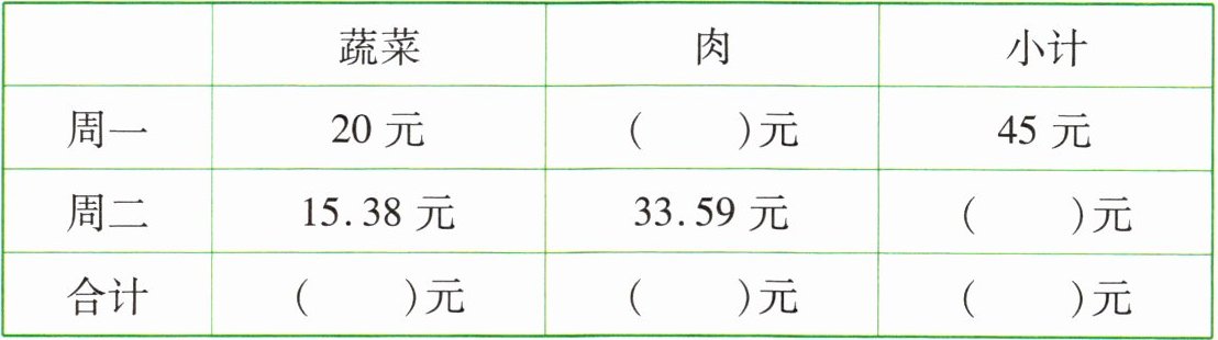 4 苗苗记录了家里两天买蔬菜和肉的花费支出情况,请你帮助她把表格填写完整。
