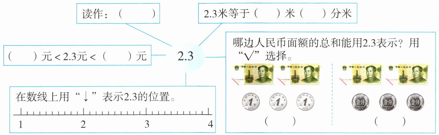 2.3在哪边人民币面额的总和能用2.3表示?用“√”选择。