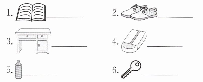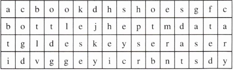 圈词答案略 1. book 2. shoes 3. desk 4. eraser 5. bottle 6. key