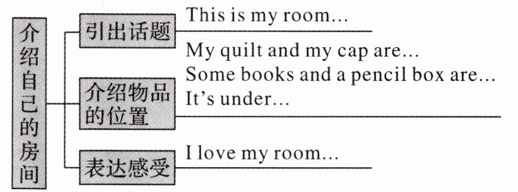 第一步:写前审题 体裁:说明文 人称:第一人称和第三人称 时态:一般现在时 第二步:必备短语——根据写作要点翻译短语 1. my room 2. in the room 3. on the table 4. a football 5. my schoolbag 第三步:炼词成句——结合上一步中的短语和括号内提示完成句子 6. This is my room. 7. There is only a bed,a table,a desk and a chair in the room. 8. A book and a clock are on the table. 9. I have a football. 10. Where is my schoolbag? 第五步:组句成篇 My name's Tom. This is my room,a small but tidy one. A place for everything and everything in its place. There is only a bed,a table,a desk and a chair in the room. My quilt and my cap are on the bed. What colour is my quilt? It's blue. My cap is white. A book and a clock are on the table. Some books and a pencil box are on the desk. I have a football. It's under the chair. Where is my yellow schoolbag? It is on the floor. Everyone needs to keep tidy. I love my room very much.